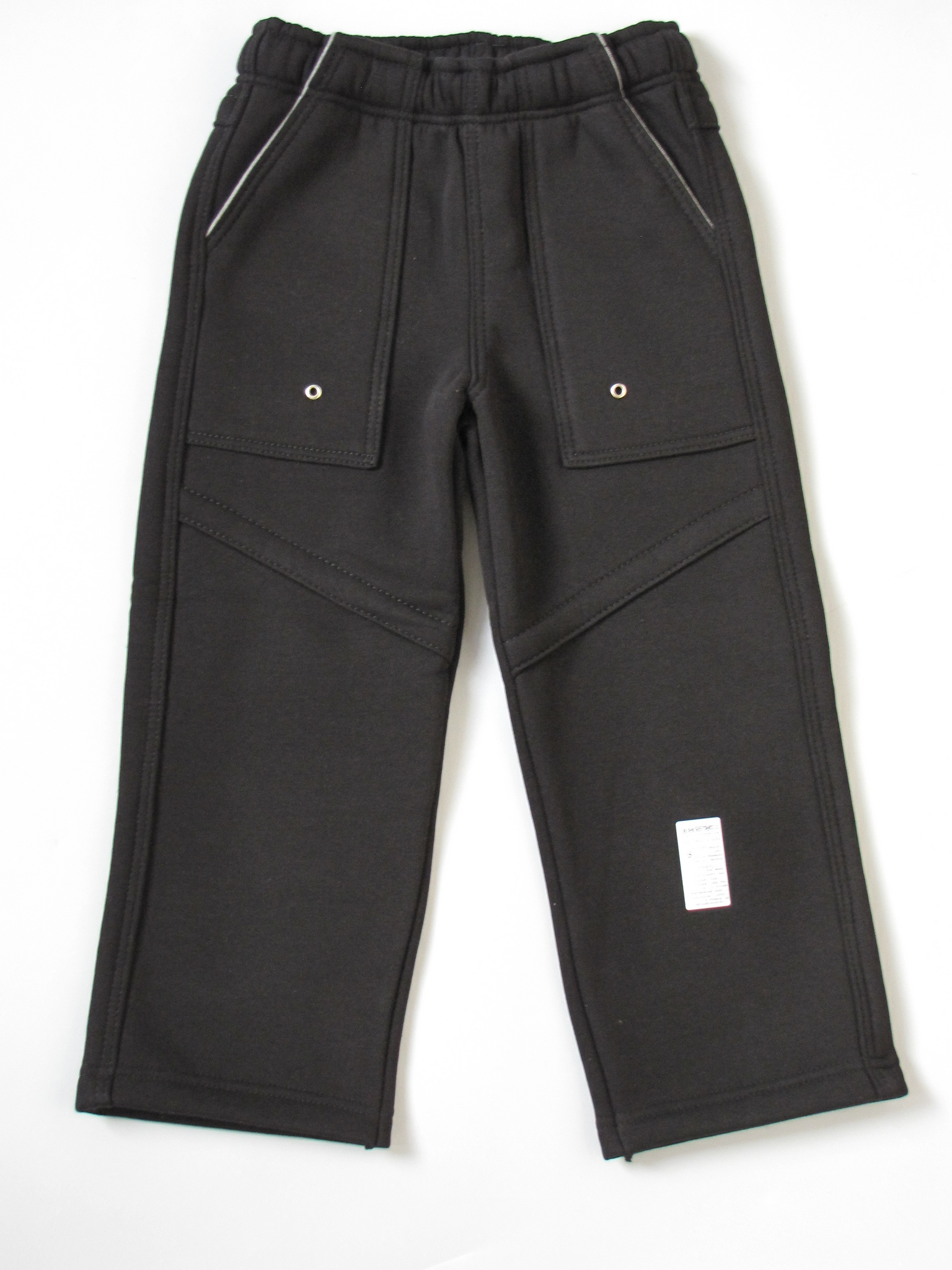 Брюки. Футер, 65%х/б, 35%п/э. Прямые, смещенный боковой шов. Рельефы на передней половинке брюк, два накладных кармана. На задней половинке брюк кокетка, накладные карманы с отделкой. Пояс на резинке со шнуром, низ брюк подшит на 2-х игольной машине.