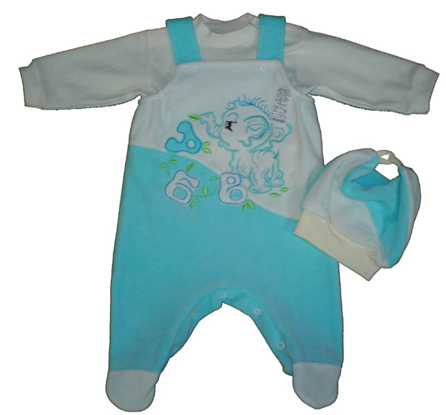 Комплект. Интерлок, велюр, 100% х/б. Комбинезон (велюр) – на брителях, впереди вышивка, застежка по шаговому шву на кнопки. Кофточка (интерлок) – длинный рукав, воротник стойка, застежка в плечевом шве на кнопки. Шапка – колпачок.