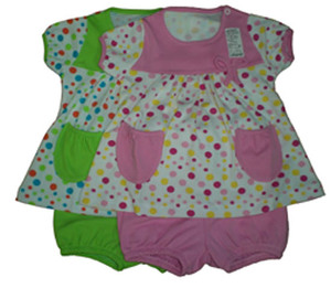 Интерлок, 100% х/б. Платье – отрезная кокетка по полоске, сборка под кокеткой, отделочный бант. Рукав «фонарик», окантован. Горловина, карманы – окантованы. Застежка в плечевом шве на кнопки. Штанишки – на резинке по верхнему срезу и по штанишкам внизу.